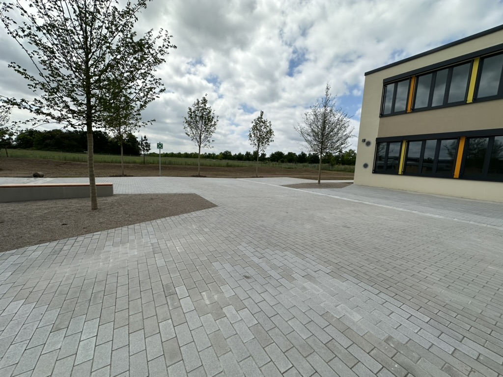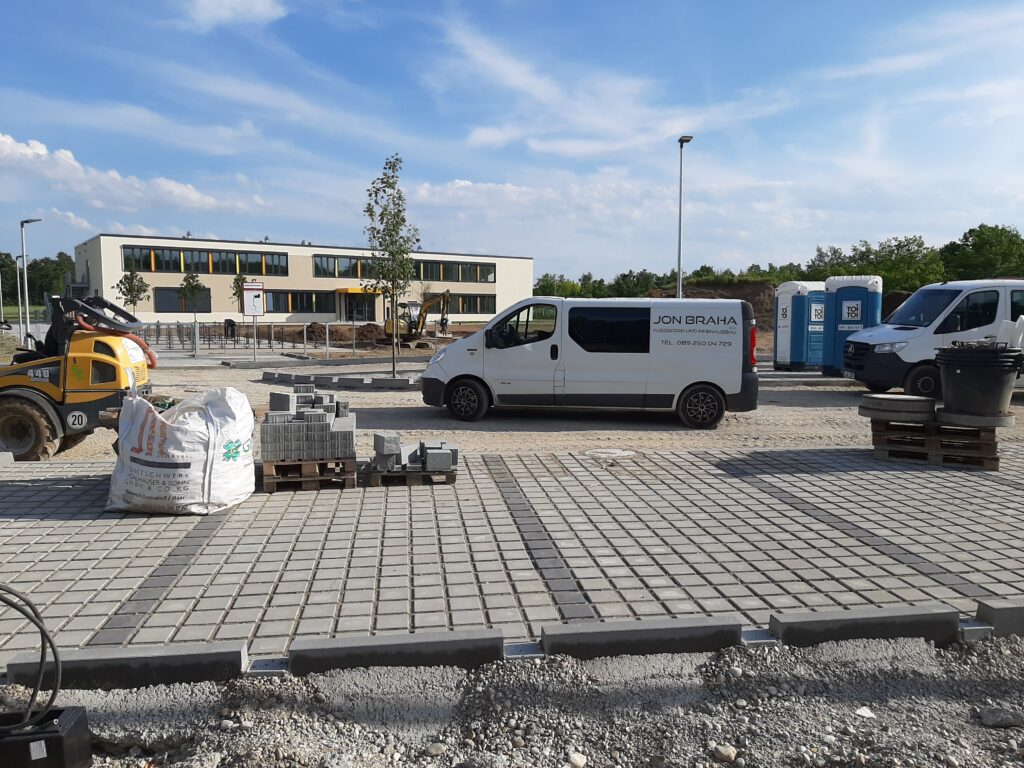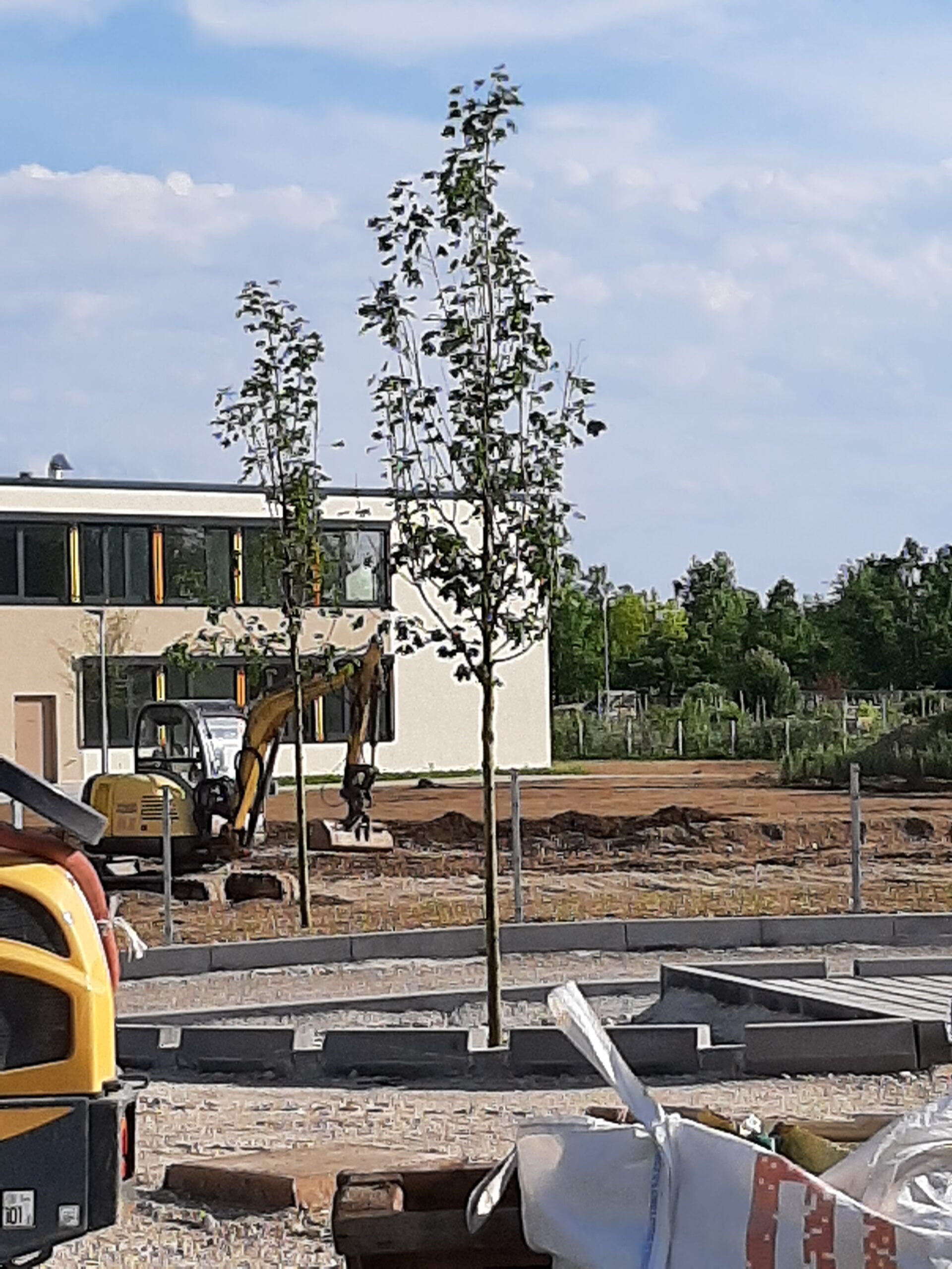 Nun ist er endlich da, der Frühsommer. Und mit ihm auch die Firmen, die sich um die Außenanlagen des Neubaus kümmern. Trotz Starkregen und Unwetterkapriolen wurden bereits der Vorgarten und die Parkplätze angelegt. Die große Erdfläche vor dem Haupteingang läßt schon die künftige Grünfläche erahnen. Und auch die große Terrasse vor der Schule wurde abgesteckt. Hier können die Schüler dann ihre Pausen verbringen es kann aber auch die ein- oder andere Unterrichtsstunde unter freiem Himmel stattfinden. Lernen mit allen Sinnen – das ist gelebte Montessori Pädagogik.