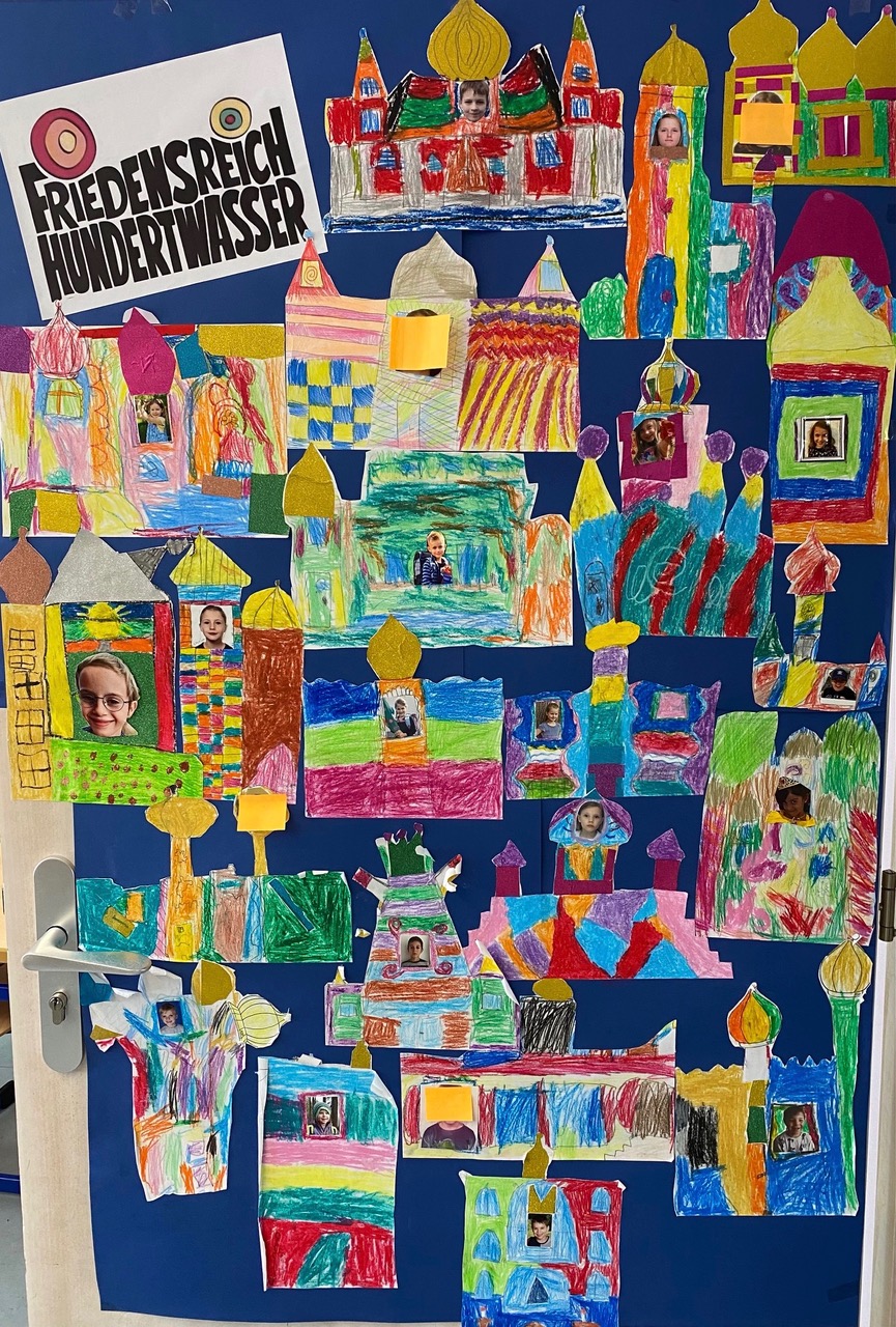 Die Diamantklasse (1.-3. Klasse) startete im Herbst mit dem Projekt „Hundertwasser“. Grundlage dafür lieferte das Bilderbuch: „Hundertwasser – Ein Haus für dunkelbunte Träume“ von G. Elschner und L. Vandevelde. In diesem Buch zeigt der Künstler Friedensreich Hundertwasser, wie der Mensch im Einklang mit der Natur bauen und leben kann. Besonders gefiel den Kindern das „Fensterrecht“, das Hundertwasser forderte: jeder Hausbewohner soll das Recht haben, die Fenster seiner Wohnung selbst zu gestalten. Jeder soll sich aus dem Fenster lehnen und die Außenwand so weit umgestalten dürfen, wie sein Arm reicht. Die Kinder malten dann mit viel Spaß und Eifer „ihre“ Hundertwasser-Häuser mit mindestens einem Fensterrahmen, in das jedes Kind ein Foto von sich kleben durfte. Zu guter Letzt bauten wir aus allen Häusern „unsere“ Hundertwasser-Stadt.