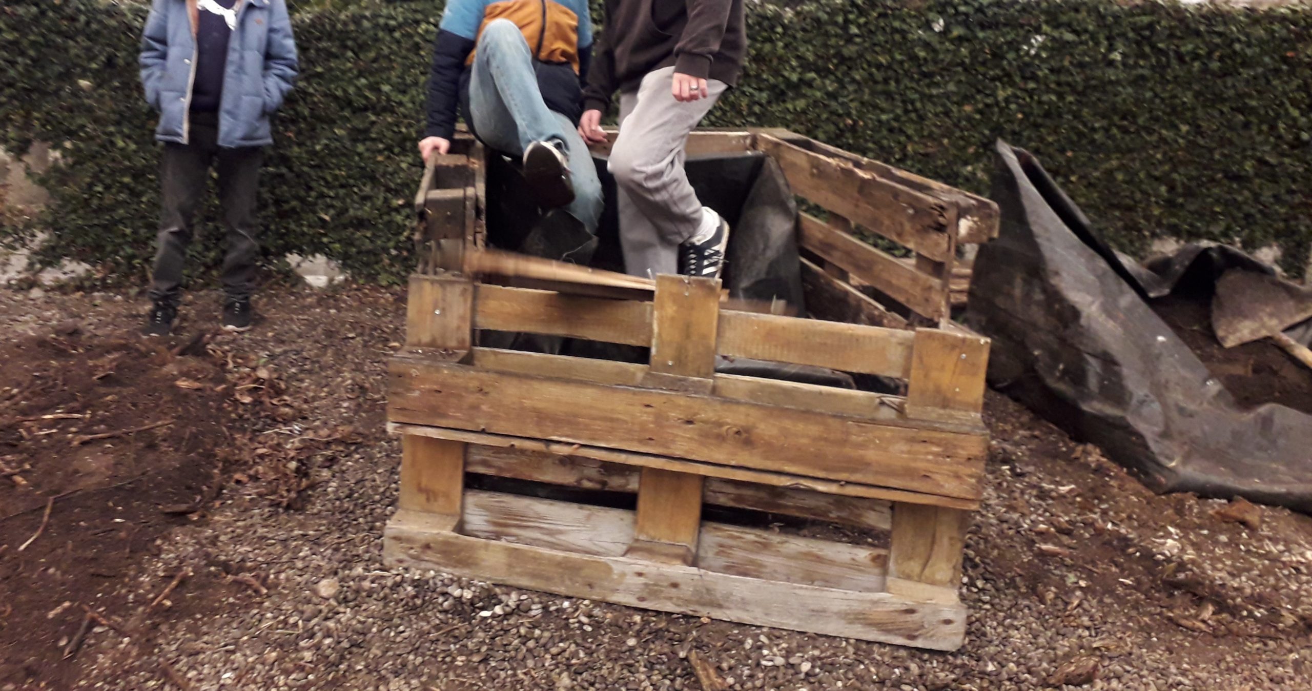 Im März ging es dann bei uns auf dem Schulgelände los: wir mussten die ganze Erde aus den alten Beeten rausschaufeln, um sie abreißen zu können. Dabei haben wir noch ein paar Kartoffeln gefunden, die wir bei der Ernte im letzten Herbst übersehen hatten. Anschließend haben wir versucht, die Schrauben aus den Paletten herauszuholen, um die Beete auseinander zunehmen, aber das hat nicht geklappt, weil das Holz schon morsch war. Deshalb haben zwei von uns die Beete auseinandergetreten. Das hat viel Spaß gemacht, aber wir mussten dabei auf die rostigen Nägel aufpassen, damit sich keiner verletzt. Aber es ist alles gut gegangen.