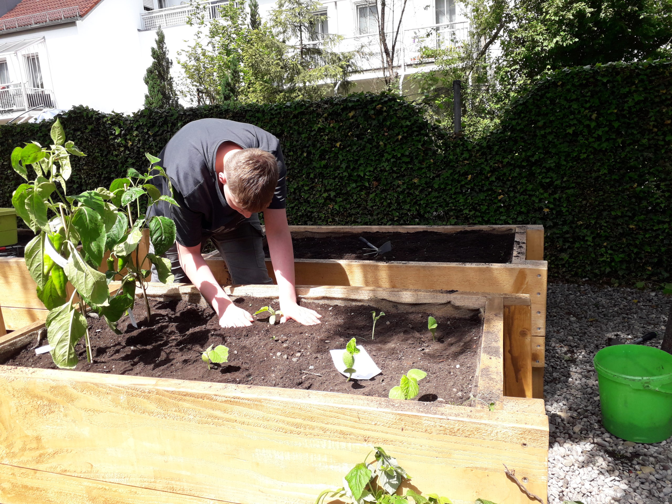 Die Teichfolie haben wir noch behalten, um sie wiederzuverwenden. Die ganze Erde, die wir rausgeschaufelt haben, haben wir auf einen Haufen geschüttet, um sie für die neuen Beete zu nutzen. Dann wurden die neuen Beete, die in der JBS gebaut worden waren, platziert. Wir haben sofort begonnen, Erde in die Beete zu schaufeln. Dabei haben wir versucht, Steine und Wurzeln aus der alten Erde zu entfernen. Nur die Regenwürmer sind mit in die neuen Beete umgezogen.